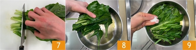 Limpia las verduras cortando la base de los tallos 7. En una sartén calienta un poco de aceite, agrega las acelgas 8 y condimenta con sal 9 y pimienta.