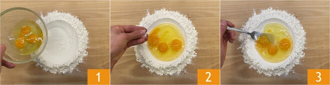 Para preparar las lasañas pesto y ricotta, lo primero que hay que hacer es disponer la harina en forma de volcán y verter en el centro los huevos 1. Añadid la sal 2 y comenzad a incorporar la harina con un tenedor 3.