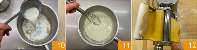 Cuando se haya formado el roux, verted la leche caliente 10 y llevad a ebullición. Dejad espesar al fuego, removiendo continuamente hasta alcanzar la consistencia deseada 11. Mantened caliente hasta el momento de su utilización. Una vez transcurrido el tiempo de reposo de la pasta, retomad la masa y extendédla con ayuda de una máquina de pasta para obtener láminas de aproximadamente 2 mm de grosor 12.