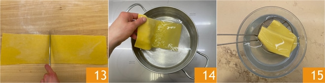 Cortad las láminas del tamaño de la bandeja que vayáis a utilizar 13. Escaldad las láminas, una a una, en agua hirviendo con sal 14. Escurridlas e inmediatamente enfriadlas sumergiéndolas en un bol con agua fría 15.