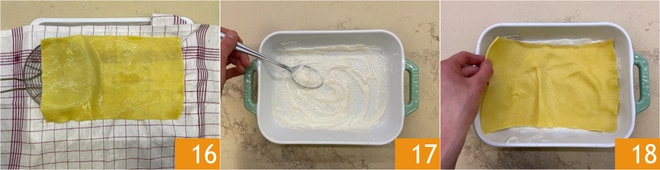 Finalmente, extendedlas sobre un paño limpio para que se sequen bien 16. Estáis listos para montar la lasaña: distribuid en el fondo de la bandeja un par de cucharadas de bechamel 17, luego cubrid con una lámina 18.