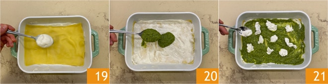 Espolvoread la superficie con más bechamel 19, luego haced lo mismo con el pesto 20 y distribuid montones de ricotta 21.