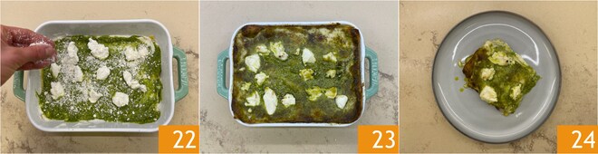 Espolvoread con parmesano 22 y continuad haciendo capas de esta manera hasta agotar los ingredientes. Cocinad en horno estático precalentado a 180° durante 25 minutos. Sacad del horno 23 y dejad reposar durante 10 minutos antes de servir. ¡Vuestras lasañas pesto y ricotta están listas para disfrutarse 24!