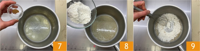 Aromatizad con nuez moscada 7. Cuando la mantequilla esté derretida, añadid la harina 8 y cocinad durante 2 minutos a fuego bajo, removiendo continuamente 9.