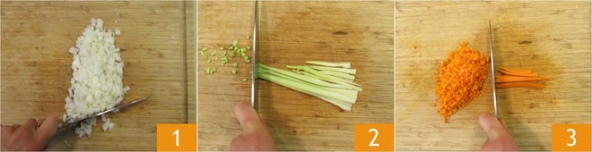 Para preparar la lasaña montañesa, comience con el ragú de salchicha: limpie y pique finamente la cebolla 1, el apio 2 y la zanahoria 3.