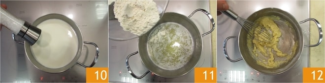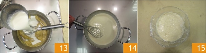 Vierta un poco de leche caliente 13, mezcle, y vierta el resto de la leche. Cocine la bechamel durante unos 5-6 minutos 14 hasta que espese. Conserve a temperatura ambiente cubierta con film plástico en contacto 15.