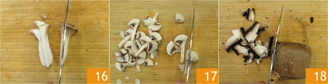 Ocupe de las setas: limpie las setas raspando con un cuchillo la parte más terrosa. Corte los rebozuelos en rodajas 16 y haga lo mismo con los champiñones 17 y los portobello 18.