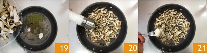 Caliente un hilo de aceite de oliva virgen extra en una sartén grande. Añada el diente de ajo, deje que suelte su sabor. Añada las setas 19 y saltéelas en la sartén durante 2-3 minutos, o hasta que estén cocidas. Sal 20, retire el diente de ajo 21.