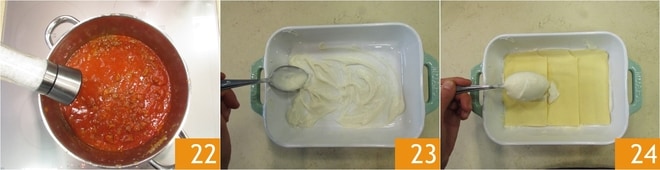 Mientras tanto, el ragú también estará listo 22, ajuste de sal. Tome una fuente rectangular (medidas 24 x 17 x 6), ponga una primera capa delgada de bechamel 23, coloque encima 3 hojas de pasta de huevo superponiéndolas ligeramente, añada una capa de bechamel 24.