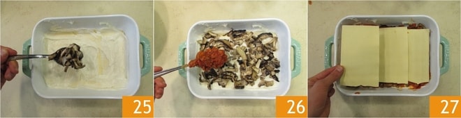 Ahora añada parte de las setas 25, y luego una capa de ragú 26 y una de pasta 27. Continúe montando la lasaña alternando las capas hasta agotar los ingredientes y obtener cuatro capas.
