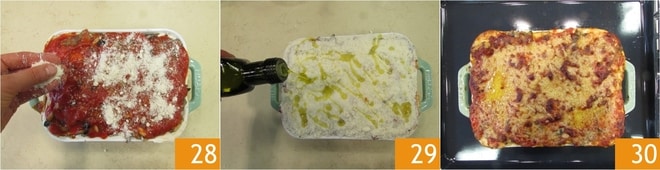 Cubra el ragú de la última capa con Parmigiano Reggiano DOP rallado 28. Rocíe con un hilo de aceite 29. Hornee en horno estático a 200 grados durante 25 minutos, al final configure la función grill durante 5 minutos para gratinar la superficie. Saque del horno 30 y deje templar la lasaña montañesa antes de servirla.