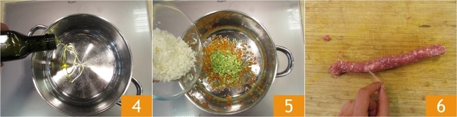 Caliente un hilo de aceite en la cacerola 4 y prepare el sofrito 5. Cocina a fuego medio durante 6-7 minutos, removiendo de vez en cuando. Retire la tripa de la salchicha 6.