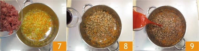 Agregue la salchicha desmenuzada 7, dore a fuego medio durante unos 5 minutos, removiendo con frecuencia. Desglase con vino tinto 8 y deje evaporar. Luego agregue la salsa de tomate 9, sal y cocine el ragú a fuego medio-bajo durante aproximadamente 1 hora: debe obtener una consistencia ligeramente líquida.