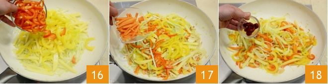 En una sartén grande, vierte abundante aceite de oliva. Añade el diente de ajo, las cebollas, el puerro, las patatas y los pimientos 16. Luego añade también el apio y las zanahorias 17 e incorpora el concentrado de tomate 18. Mezcla y deja que las verduras se ablanden con una tapa durante unos 10 minutos.