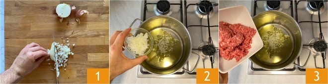 Para preparar las lasañas al horno, primero pela la cebolla y pícala finamente 1. Colócala en una olla grande con un poco de aceite 2 y deja que se ablande durante unos minutos a temperatura media, luego añade también la carne picada 3.
