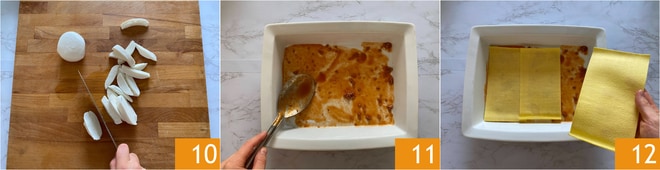 Ahora corta la mozzarella en trozos 10. Consigue una bandeja para lasañas de 30x20 cm y esparce una capa de salsa en el fondo 11. Realiza una primera capa de láminas de pasta, superponiéndolas ligeramente 12.