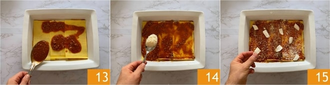 Añade más salsa 13, luego el Grana Padano DOP rallado 14 y los cubos de mozzarella 15.