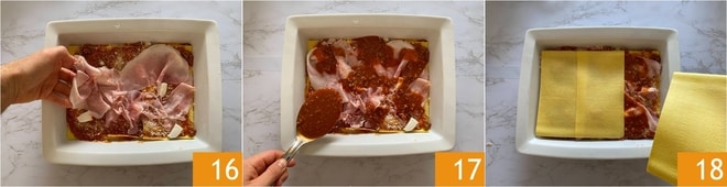 Coloca encima las lonchas de jamón 16 y añade un poco más de salsa 17. Coloca otra capa de pasta encima 18. Procede de esta manera hasta terminar todos los ingredientes.