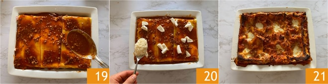Recuerda que la última capa será solo de pasta, salsa 19, queso rallado y mozzarella 20. Cocina en horno estático precalentado a 180° durante unos 45 minutos. Luego saca del horno y deja reposar unos minutos 21 antes de cortar y servir vuestras ricas lasañas al horno.