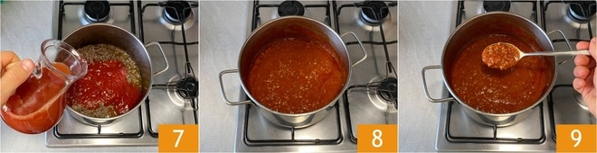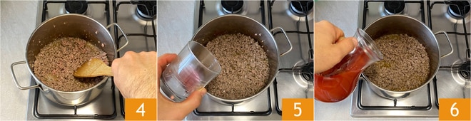 Sube el fuego y deja que se dore, mezclando y desmenuzando la carne con una cuchara de madera 4. Cuando esté bien dorada, añade el vino tinto 5 y deja que se evapore la parte alcohólica. Baja nuevamente el fuego y añade el puré de tomate 6.