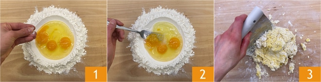 Para preparar las lasañas al pesto al microondas, empezad con la preparación de la pasta fresca: en una superficie de trabajo poned la harina en forma de volcán, cascád las huevos en el centro, añadid una pizca de sal 1 y batidlas rápidamente 2. Mezclad el compuesto ayudándoos con una espátula 3.