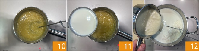 Mezclad en el fuego medio con un batidor para evitar la formación de grumos 10. Cuando hayáis obtenido un compuesto color avellana, añadid una parte de la leche caliente para diluir 11, mezclad y verted todo en la parte restante de la leche 12. Dejad cocinar a fuego bajo hasta obtener una salsa viscosa, luego reservad.