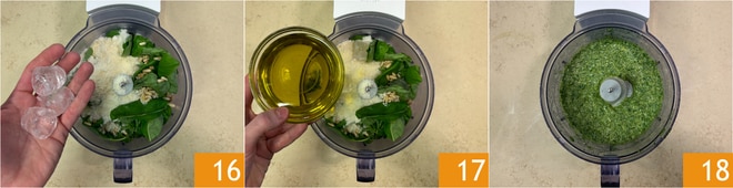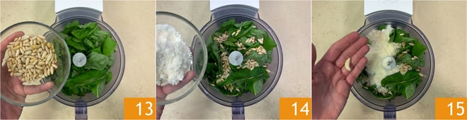 Finalmente preparad el pesto: en un mixer poned la albahaca, luego añadid los piñones 13, el Parmesano, el pecorino 14 y el ajo 15.