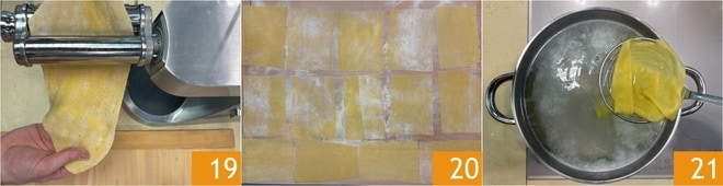 Retomad la masa y divididla para que sea más fácil de manejar. Estirad la masa con la ayuda de una máquina de pasta 19, ajustando gradualmente el grosor hasta llegar a un espesor de 1-2 mm. Cortad las láminas en rectángulos de 15x10 cm 20, luego escaldadlas en agua salada 21.