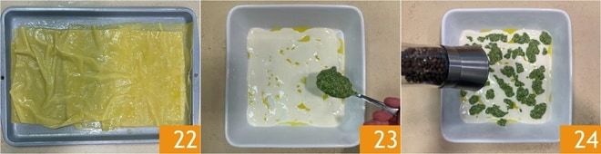 Disponed las láminas en una bandeja, ligeramente untada, y dejad templar 22. Componed la lasaña, en una bandeja de 25x25 cm, distribuyendo en el fondo un poco de aceite y un cucharón de bechamel, luego continuad con el pesto 23 y añadid un poco de pimienta 24.