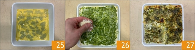 Colocad otra capa de láminas de pasta 25 y continuad de la misma manera hasta llegar a un total de 5 capas. Completad espolvoreando la superficie con el Parmesano 26. Cocinad en microondas a 500 W durante 10 minutos, luego continuad la cocción por otros 5 minutos en modo grill. ¡Las lasañas al pesto al microondas están listas 27!