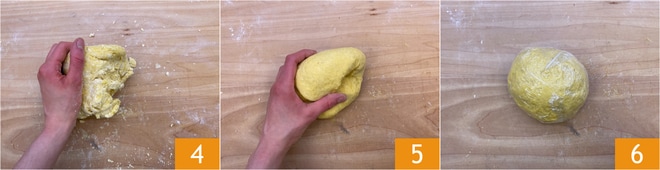 Luego continuad trabajando con las manos 4, hasta obtener una masa lisa y homogénea 5. Cubrid con film transparente y dejad reposar en la nevera durante 15 minutos 6.