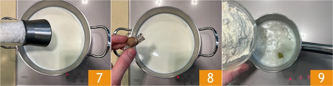 Pasad a la bechamel. Poned a calentar la leche en una olla, añadid sal 7 y nuez moscada 8. En un cazo preparad el roux: derretid la mantequilla cortada en trozos grandes, luego añadid la harina 9.