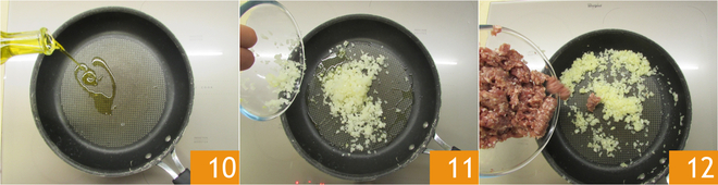 En una sartén, añade un chorrito de aceite 10, calienta ligeramente y luego añade la cebolla picada 11. Cocina a fuego lento durante unos 5 minutos, removiendo de vez en cuando. Añade la salchicha desmenuzada 12, sofríe durante unos 8 minutos, o hasta que esté completamente cocida.