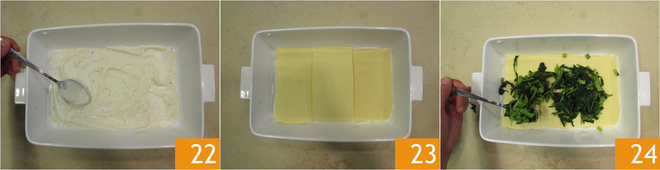 Arma la lasaña: coloca en el fondo de una fuente de 30 x 21 x 7 cm un par de cucharadas de bechamel 22, coloca 3 láminas de lasaña al huevo ligeramente superpuestas, presiona un poco para que todo quede bien adherido. Añade los grelos 24.