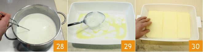 Entonces continúa mezclando con la varilla para espesar la bechamel a fuego lento 28. Toma una bandeja de 30x20 cm y riégala con un poco de aceite; distribuye una capa de bechamel 29 y coloca una capa de lasañas 30.
