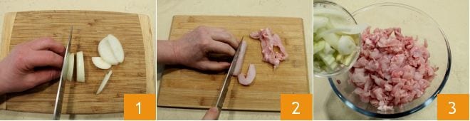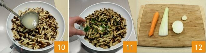 Puedes alargarlas con un poco de caldo de carne 10 para favorecer la cocción, pero deberán cocinarse pocos minutos quedando crujientes; ajusta de sal y pimienta, añade el perejil picado 11, mezcla y apaga el fuego. Prepara ahora el ragú de conejo: toma la cebolla, el medio tallo de apio y una zanahoria 12 para picarlos finamente.