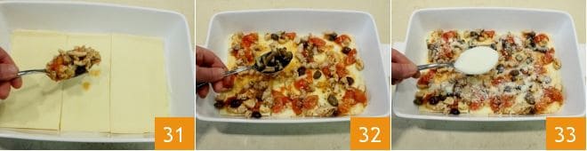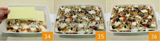 Condimenta con una capa de ragú de conejo 31, una de setas 32, luego continúa espolvoreando el Parmesano rallado y unas cucharadas de bechamel 33.