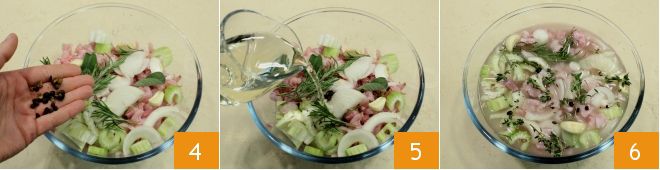 las hojas de salvia, las ramitas de romero, las hojas de tomillo, las bayas de enebro 4; luego cubre todo con el vino blanco 5 y deja marinar por al menos dos horas o toda la noche 6, cubierto con film transparente y en el frigorífico.