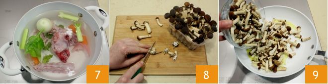 Para preparar el caldo, vierte el agua en una cacerola, luego añade los huesos del conejo, la cebolla, el apio, la zanahoria y una pizca de sal: deja hervir a fuego muy bajo durante al menos 1 hora. Mientras tanto, dedícate a las setas: limpia las setas cortando la parte final 8, lávalas; después escáldalas durante 15-20 minutos antes de verterlas en una sartén amplia en la que habrás sofreído ligeramente el ajo picado con un poco de aceite 9.