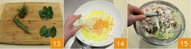 Haz la misma operación también con el ajo, salvia, tomillo, laurel, romero 13. Riega con un poco de aceite una sartén amplia, luego añade el picado de cebolla, apio y zanahoria y el diente de ajo 14 y dora el sofrito a fuego bajo. Escurre cuidadosamente el conejo de la marinada, quita los olores 15.