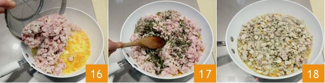 Cuando el sofrito esté pochado, añade el conejo 16 y las hierbas aromáticas picadas 17, luego dora durante 10-15 minutos 18.