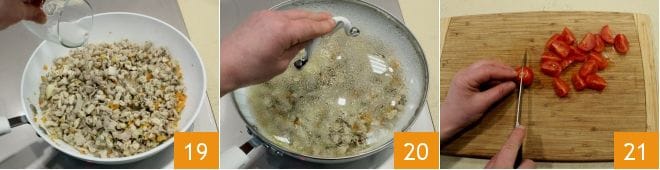 Desglasa la carne con el vino blanco 19, deja evaporar, luego añade el caldo de conejo de vez en cuando, cocinando con la tapa 20, hasta que la carne esté bien tierna: tardará alrededor de 1 hora. Hacia el final de la cocción, lava y corta en gajos los tomates cherry 21,