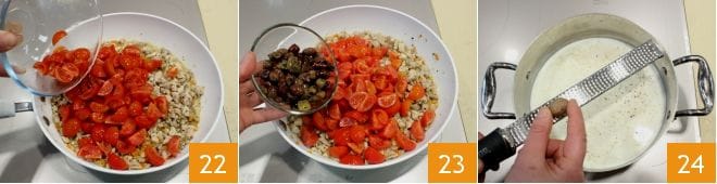 únelos al ragú de conejo 22, luego añade también las aceitunas taggiasche deshuesadas 23. Ajusta de sal y pimienta y luego apaga el fuego. Dedícate luego a la bechamel: en una cacerola calienta la leche, aromatízala con la nuez moscada rallada 24 y sala y pimienta al gusto.