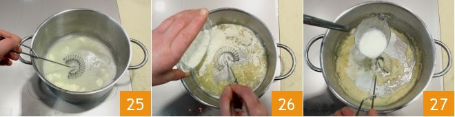 En otra cacerola amplia, vierte la mantequilla y deja que se derrita a fuego lento 25; una vez derretida, vierte la harina en forma de lluvia 26 y mezcla con una varilla para crear el roux. Cuando la mezcla se haya oscurecido un poco y se haya vuelto más densa, vierte la leche caliente 27.