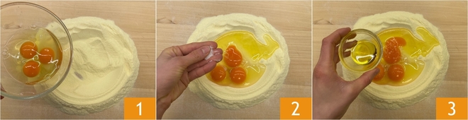 Para preparar las lasañas de achicoria, empezad con la pasta fresca: verted la sémola en la mesa de trabajo y formad un volcán, luego añadid en el centro los huevos 1, una pizca de sal 2 y el aceite 3.