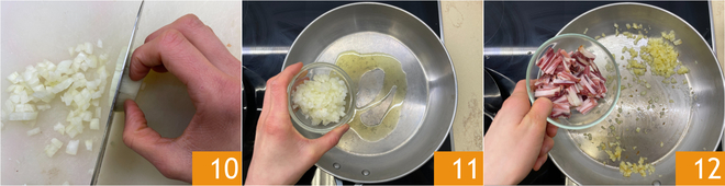 Limpiad y picad finamente la cebolla 10. Colocad la cebolla en una sartén con un poco de aceite caliente 11 y dejad sofreír durante unos minutos. Cuando esté blanda y transparente, añadid el speck 12.