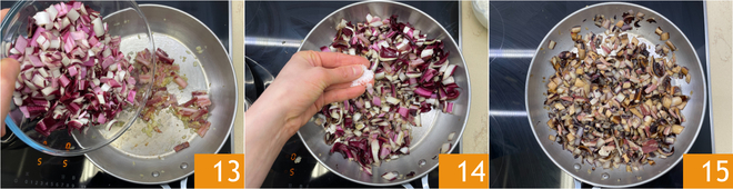 Rehogad el speck durante un minuto, luego agregad la achicoria 13 y sal 14. Cocinad a fuego medio durante 10-15 minutos, hasta que la achicoria esté tierna. Apagad el fuego y dejad enfriar 15.