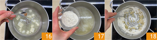 Pasad a la bechamel: derretid la mantequilla en una cacerola y sazonad con sal, pimienta y nuez moscada 16. Mientras tanto, calentad la leche en una cacerola aparte. Cuando la mantequilla esté derretida, añadid toda la harina de una vez 17 y mezclad vigorosamente con una varilla para formar el roux 18.