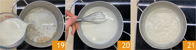 En este punto, verted gradualmente la leche caliente 19, continuando a mezclar para evitar la formación de grumos 20. Llevad a ebullición y dejad espesar la mezcla a fuego medio hasta obtener la consistencia adecuada 21.