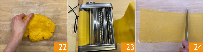 Pasado el tiempo de reposo de la masa, retomad el panecillo y presionadlo ligeramente sobre la superficie de trabajo 22, luego pasadlo por la máquina de pasta desde el grosor más amplio hasta el último; deberéis obtener láminas de unos 1-2 mm de grosor 23. Cortad las láminas para obtener rectángulos ligeramente más pequeños que la bandeja que utilizaréis 24.
